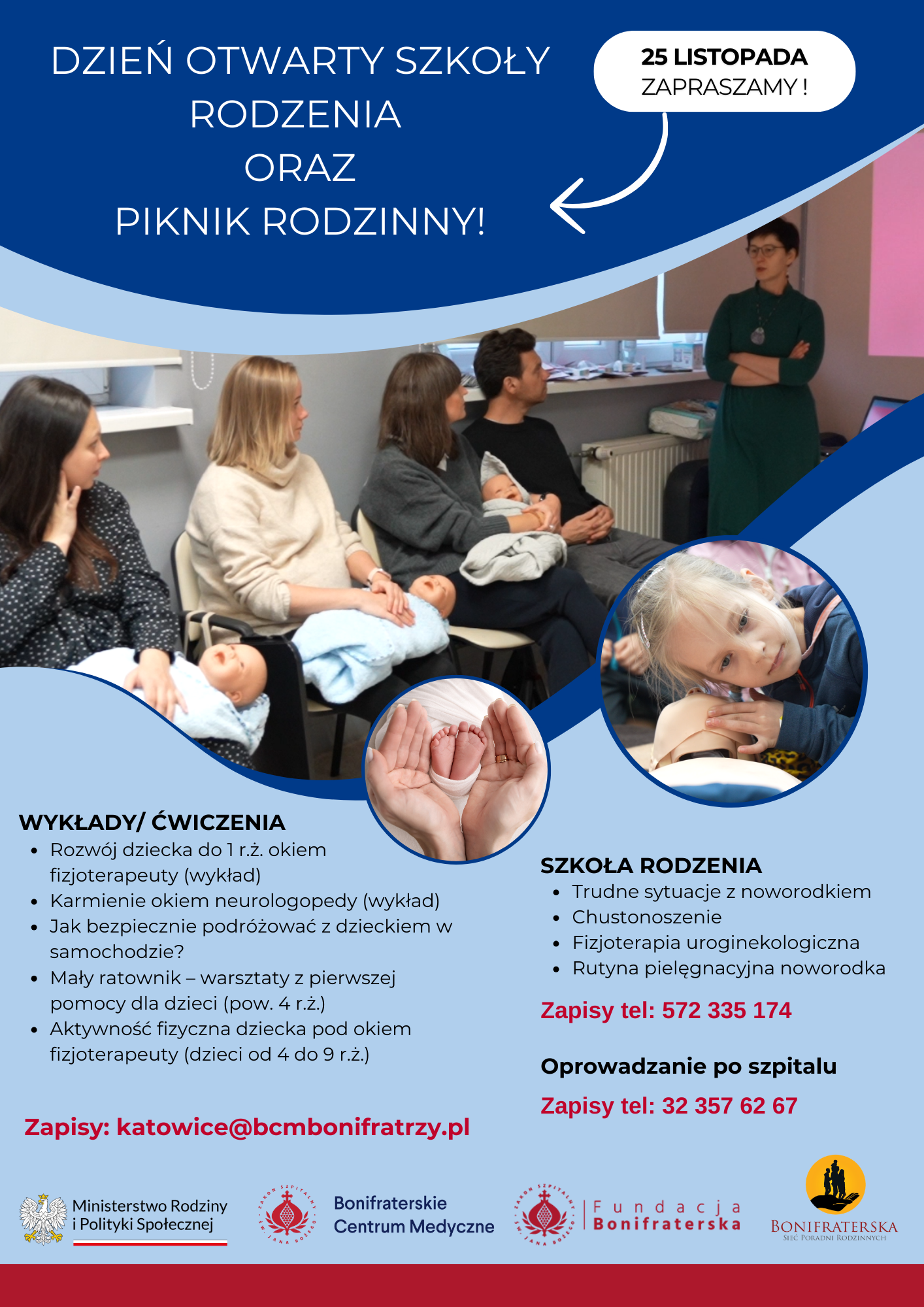 We współpracy z Fundacją Bonifraterską organizujemy specjalnie dla Was Dzień Otwarty Szkoły Rodzenia i Piknik Rodzinny. Wydarzenie to jest dofinansowane przez Ministerstwo Rodziny i Polityki Społecznej w ramach programu „Po pierwsze Rodzina”.