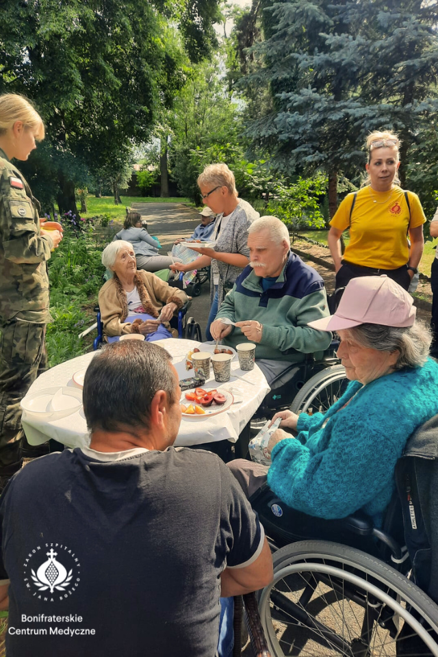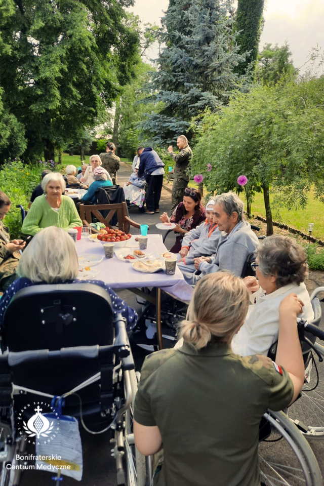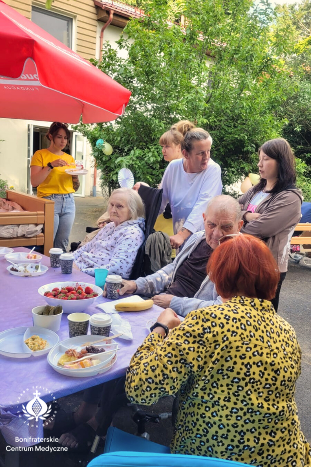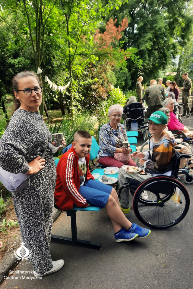 Rodziny przyszły dość licznie, panowała bardzo radosna atmosfera, nie zabrakło naszych wspaniałych wolontariuszy, a także przyjaciół z Akademii Wojsk Lądowych. Podczas tego pięknego popołudnia pracownicy hospicjum przy gotowali pyszne jedzenie z grilla, a wolontariusze i rodziny zadbały o słodkości – wielki tortu, mnóstwo ciast i świeżych owoców. Przy niektórych stolikach było słychać nawet radosne śpiewy, a w całym ogrodzie unosiła się atmosfera bliskości, dobra i przyjaźni.