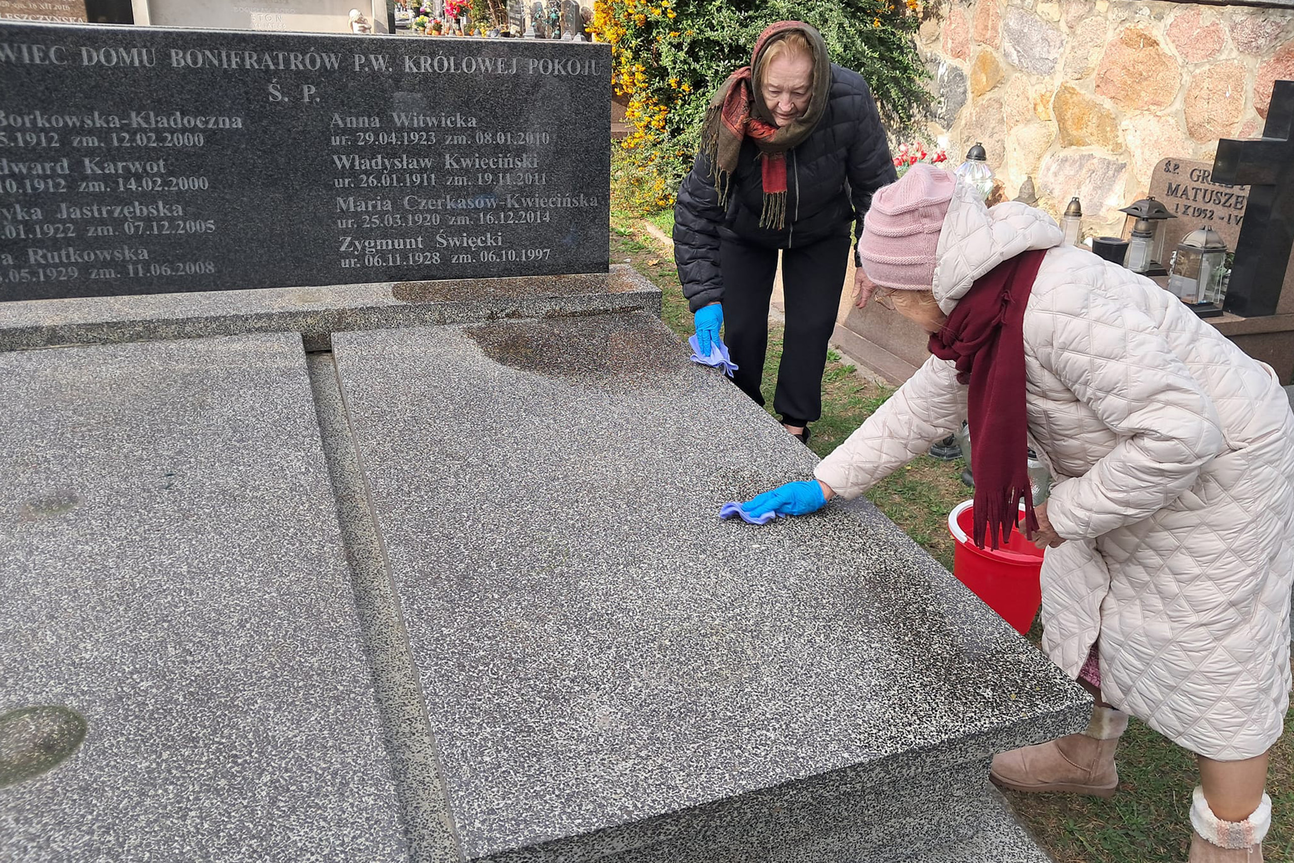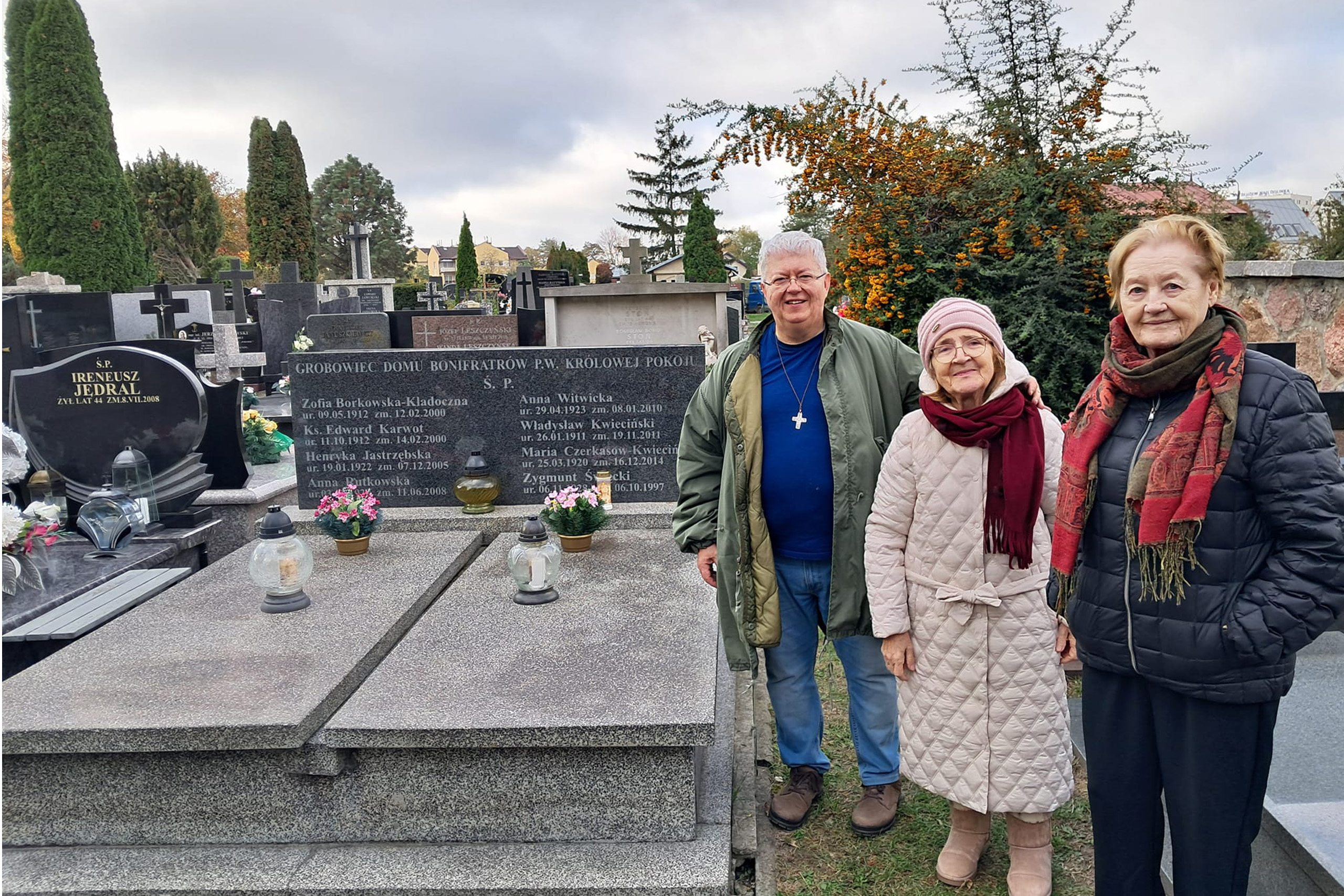 Dlatego w ostatnich dniach października został zorganizowany tradycyjny wyjazd na stary cmentarz na stołecznym Służewie. Jest on położony przy terenach plebanii kościoła św. Katarzyny przy ulicy Fosa. Na tej nekropolii znajduje się grobowiec Domu Bonifratrów p.w. Królowej Pokoju. W składzie delegacji z warszawskiego DGR-u znalazło się dwoje pensjonariuszy, terapeutka zajęciowa – Pani Agata oraz bonifrater, Ojciec Bruno oraz kapelan DGR. Obecni na cmentarzu seniorzy chętnie włączyli się w porządkowanie mogiły i zapalanie zniczy. Wspólnej modlitwie przewodniczył Ojciec Bruno.
