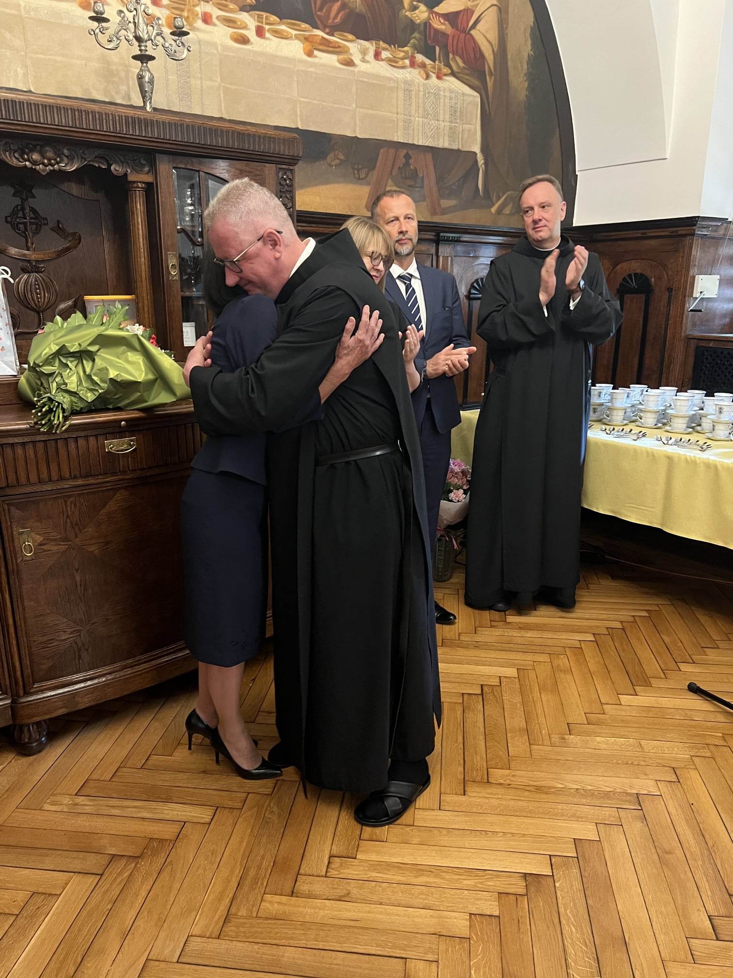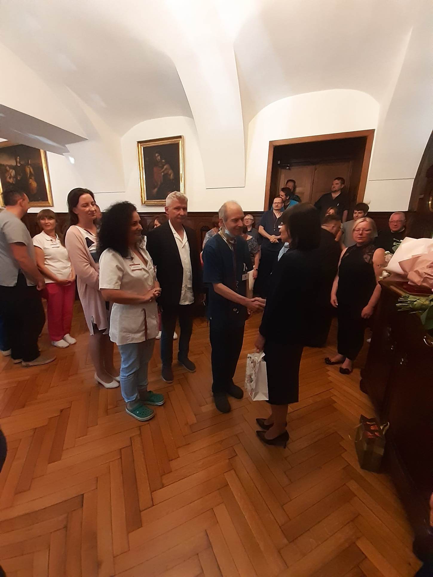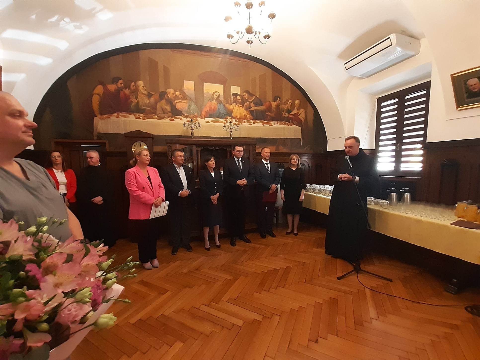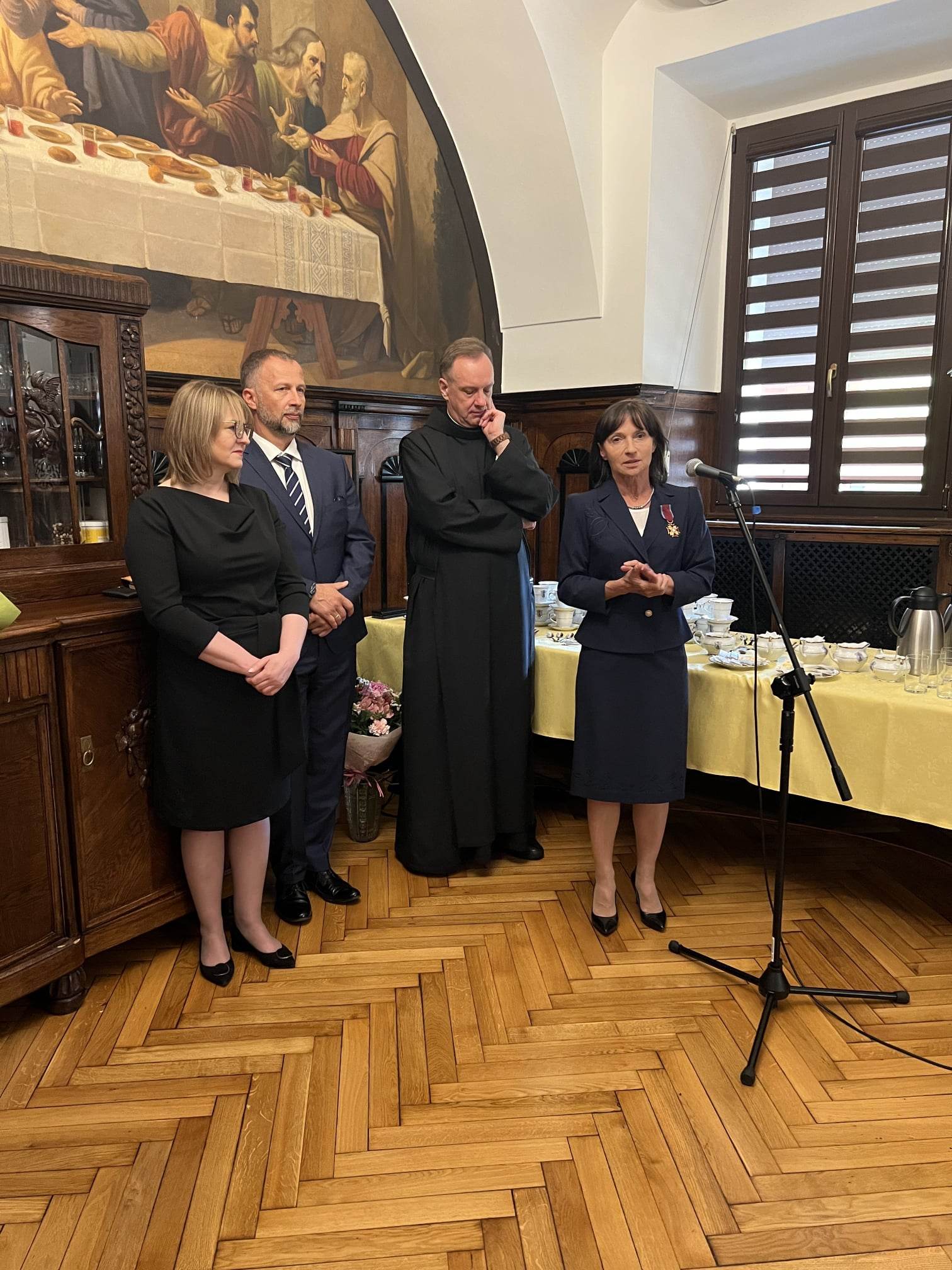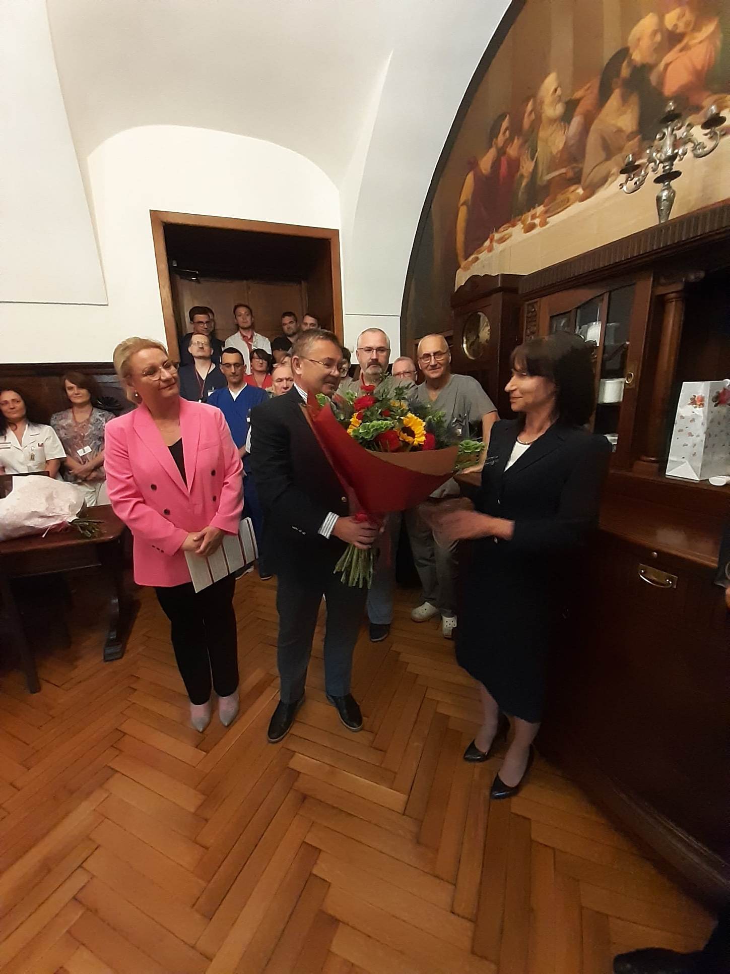 Dzień 28 czerwca 2023 roku na długo pozostanie w sercach i w pamięci zarówno Braci Bonifratrów, Współpracowników Szpitala św. Jana Grandego w Krakowie, a przede wszystkim w sercu i w pamięci naszej, nieodżałowanej Pani Prezes i Dyrektor Szpitala Doroty Puka, która przez ponad osiem lat charyzmatycznie zarządzała dziełem Bożym, jakim jest od czterystu lat Szpital Bonifratrów na Kazimierzu. Pod przewodnictwem Ojca Alberta Chmielowskiego OH, Rektora i Kustosza Diecezjalnego Sanktuarium św. Jana Bożego i Kapelana szpitala Bracia i liczne grono Współpracowników zgromadzili się o godz. 6.30 w kościele, aby w czasie Mszy świętej dziękować za Osobę Pani Dyrektor i Jej ofiarną pracę prosząc o błogosławieństwo Boże w dalszym życiu osobistym, rodzinnym i zawodowym. Wojewoda Małopolski Łukasz Kmita w uznaniu zasług na rzecz ochrony zdrowia i bezpieczeństwa zdrowia publicznego uroczyście wręczył odznaczenie, nadane przez Prezydenta Rzeczypospolitej Polskiej Andrzeja Dudę Pani Dorocie Puka, mówiąc: „Jakiś czas temu miałem zaszczyt przekazać odznaczenia państwowe grupie pracowników krakowskiego Szpitala Zakonu Bonifratrów. Dziś do tego grona dołącza P. Dyrektor Dorota Puka, otrzymując Złoty Krzyż Zasługi. To swoisty symbol wspólnego wkładu całego środowiska Szpitala w jego rozwój i bieżącą opiekę nad pacjentami, także w niełatwych czasach pandemii COVID-19. Szpital, tworząc zwarty i sprawny system naczyń połączonych, zdał tamten niełatwy egzamin. Serdecznie gratuluję i dziękuję za Państwa ciężką pracę”.
