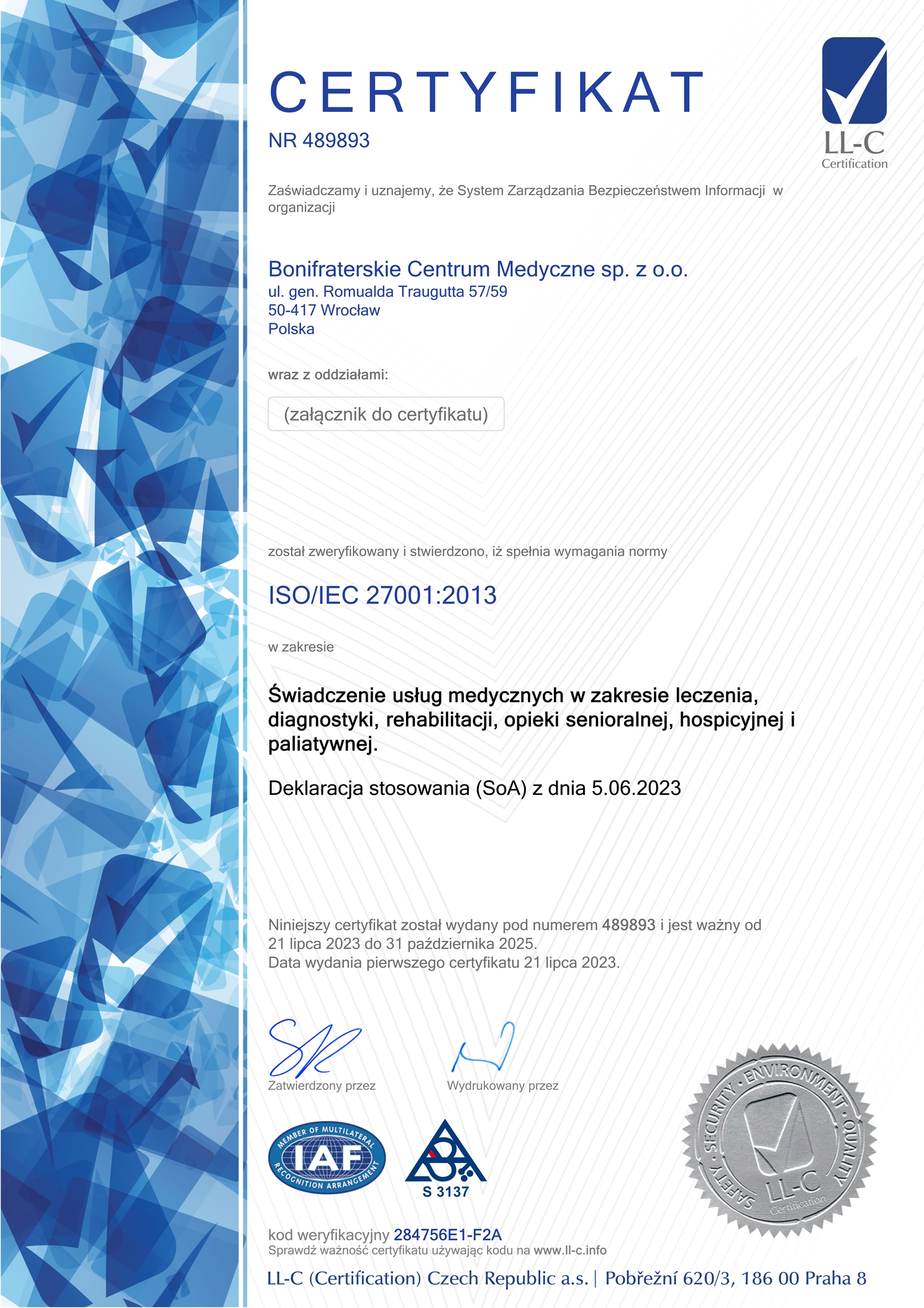 Od wielu lat wszystkie Oddziały Bonifraterskiego Centrum Medycznego sp. z o. o. posiadają certyfikat systemu zarządzania jakością ISO 9001:2015. Certyfikat ISO 27001:2017 System Zarządzania Bezpieczeństwem Informacji posiada Szpital Bonifratrów św. Jana Bożego w Łodzi. Wdrożenie i poddanie certyfikacji Systemu Zarządzania Jakością ISO zgodnego z wymaganiami międzynarodowej normy ISO 9001 i ISO 27001 polega przede wszystkim na określeniu i późniejszym stosowaniu rozwiązań proceduralnych mających zapewnić odpowiedni i stały poziom jakości realizowanych świadczeń zdrowotnych oraz bezpieczeństwa informacji. Szpitale Bonifraterskiego Centrum Medycznego sp. z o. o. Oddział w Krakowie, Katowicach i Łodzi od kilku lat utrzymują status Szpitala akredytowanego. Certyfikat ten przyznawany jest przez Ministra Zdrowia w oparciu o rekomendacje Rady Akredytacyjnej.